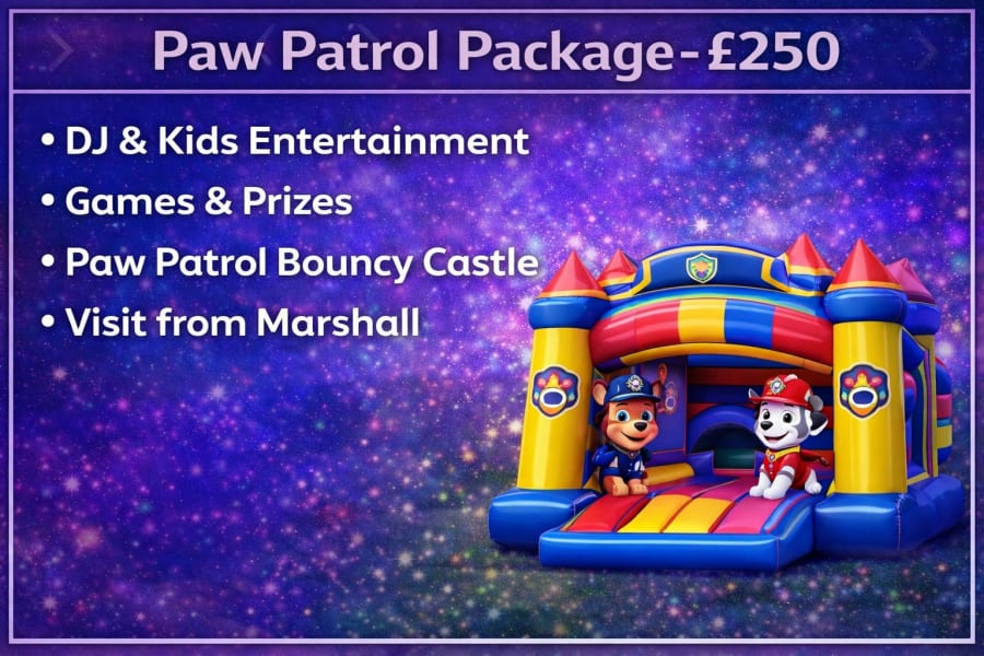 But that's not all! Our package also includes a fantastic Paw Patrol inflatable Bouncy Castles, available in both pink and blue designs. Watch as the children bounce and laugh, immersing themselves in the world of their favourite characters. And to make the party even more special, our Marshall Mascot will make a surprise visit and bring delight to all the kids!