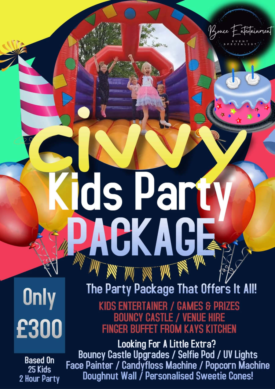 With the Civvy Civvy Party Package, we take care of all the details, allowing you to relax and enjoy the celebration. Our experienced DJ will keep the energy high and the kids entertained throughout the party. The inflatable bouncy castle will provide endless fun, keeping the children engaged and active.