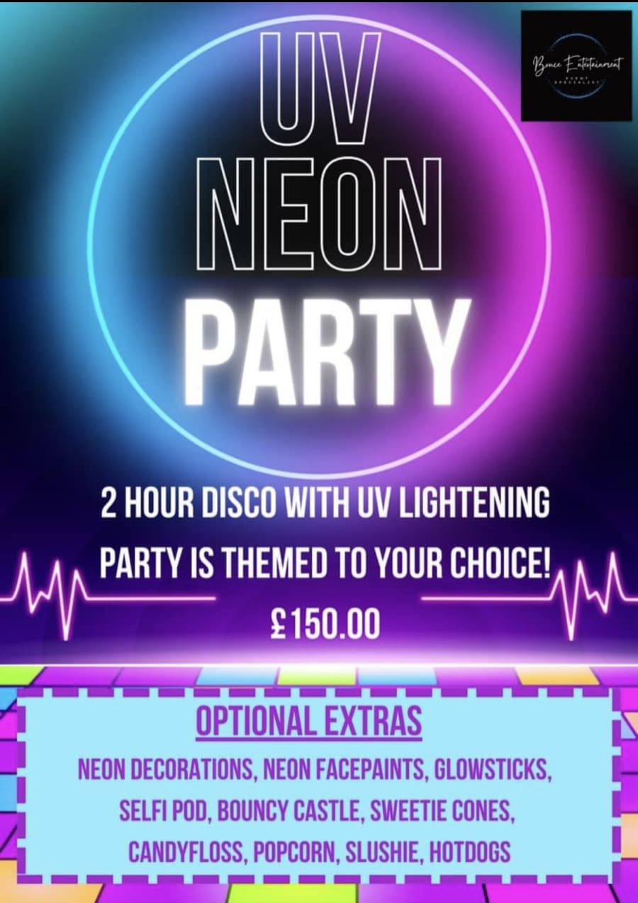 To elevate the UV Neon Party experience, we offer additional extras such as neon decorations, glow sticks, and face paints. These can be added to your package for an enhanced glow-in-the-dark experience. Contact us for a personalised quote tailored to your party needs. π«π¨