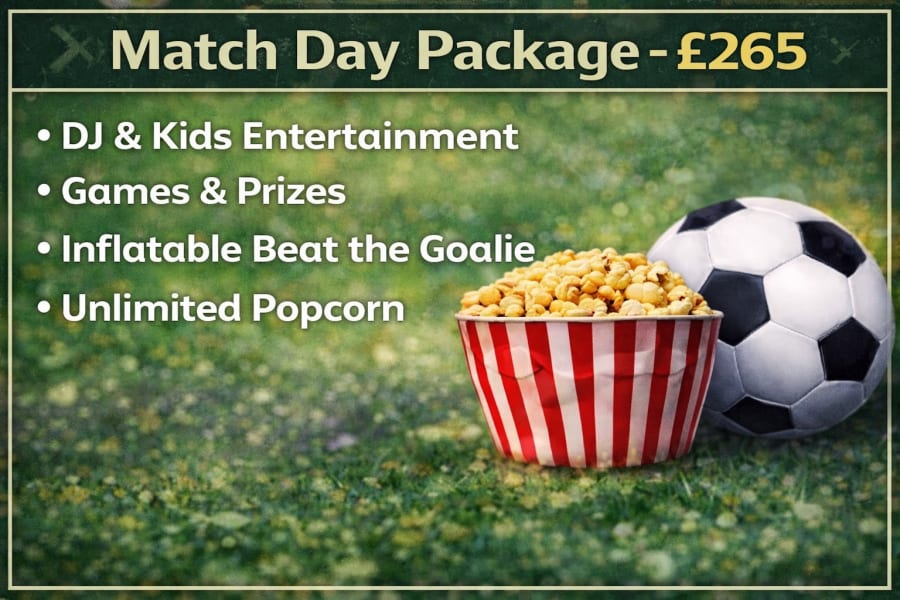 The Match Day Package delivers a high-energy, family-friendly event in a compact 2 hour party package. This experience pairs a professional DJ with a lively kids entertainer who runs games, hands out prizes, and keeps energy high. Included attractions are our Inflatable Beat the Goalie ⚽ and Unlimited Popcorn 🍿. Perfect for birthdays, club match days, school events, and celebration parties. 🎧🏆